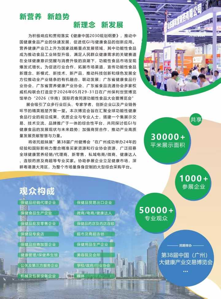2026年5月底,广州保利世贸博览馆将迎来年度大健康行业重头戏——2026广州第38届大健康展会!作为主办方,我们诚邀全国各地的大健康产业链从业者、创业者、投资者、采购商以及健康领域爱好者,共赴这场赋能行业发展、链接无限可能的行业之约。